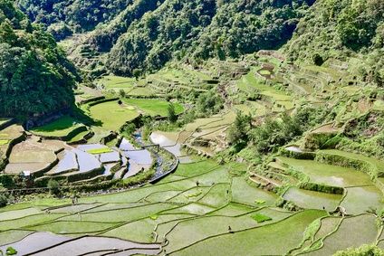 Die malerischen grünen Hügel mit Reisterrassen, die sich ungefähr 1500 Meter über dem Meeresspiegel befinden, bedecken fast zehn Kilometer der Berghänge. Schon vor ca. zweitausend Jahren begannen die damaligen Einwohner der Gegend, Reisfelder anzubauen. Damit gelten die Reisterrassen als ältestes Bauwerk der ganzen Philippinen. Inzwischen vermuten sogar einige Forscher, dass sie bereits seit knapp dreitausend Jahren existieren. Und bis zum heutigen Tag wird diese Tradition gepflegt. Auf den Terrassen werden von Einheimischen immer noch Reis und Gemüse angebaut. Dabei ist dies keine ungefährliche Sache: Die Hänge haben eine Steigung von bis zu 70 Grad. Die Wassermassen bei Regen werden durch Dämme, viele kleinere Gräben und Bambusröhren gleichmäßig verteilt. Außerdem bewirkt die natürliche Kegelform der Berge, dass in den höheren Lagen mit weniger Niederschlagsmenge auch die Anbauflächen entsprechend kleiner sind. Deshalb gibt es sogar Felder, die gerade einmal zwei Meter breit sind.