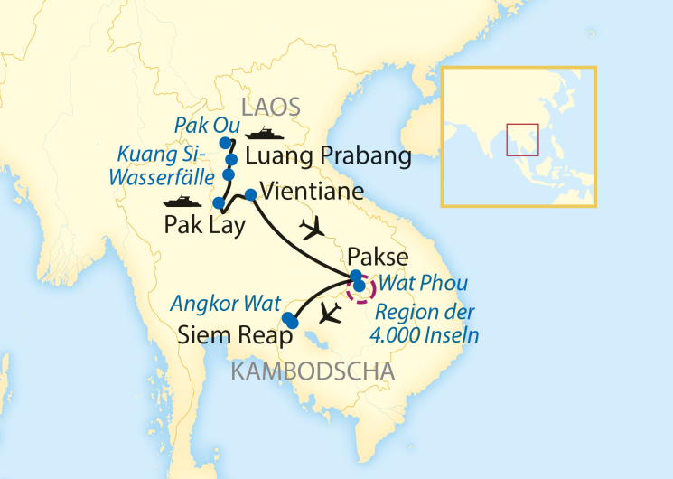 Erleben Sie die Höhepunkte der Länder Laos und Kambodscha auf einer einzigartigen Reise! Genießen Sie einen Spaziergang durch die UNESCO-Welterbe-Stadt Luang Prabang und lassen Sie sich auf Ihrem Boutique-Schiff von der einzigartigen Landschaft am Mekong auf der Strecke nach Vientiane bezaubern. Im ursprünglichen Süden des Landes sehen Sie die Ruinen eines der ältesten Khmer-Tempel, Wat Phou, und die mystische Region der 4.000 Inseln. Den beeindruckenden Abschluss Ihrer Reise bilden die Tempelanlagen um Siem Reap mit dem größten Sakralbau der Welt, Angkor Wat, der letzten Hauptstadt des Khmer-Reichs, Angkor Thom, und dem überwachsenen Tempel Ta Prohm.