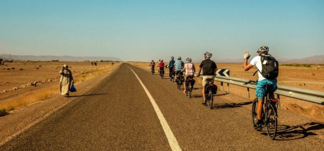 Die Dromedare bringen uns zurück zu unseren E-Bikes. Wir radeln durch die Halbwüste, im Hintergrund die dunklen Zelte der Beduinen, die in dieser weiten, kargen Landschaft seit jeher unverändert leben. Es ist ziemlich heiß. Gott sei Dank sind Wasser, Sonnencreme und Hut immer griffbereit in der Satteltasche. Die heutigen 45 km schaffe ich wohl nicht ganz, nach der Hälfte falle ich in ein Motivationsloch. Kein Problem – unser Begleitfahrzeug nimmt mich mit! Nach einem kurzen Transfer genießen wir ein traditionelles Mittagessen in Foum Zguid – ein Wüstenort wie aus einem Western und lebendiger Treffpunkt von Nomaden und Dorfbewohnern der Oasen. Der Begleitbus bringt uns am Nachmittag nach Tata, hier übernachten wir in einem kleinen, liebevoll eingerichteten Gästehaus inmitten des Dorfes. (FMA)