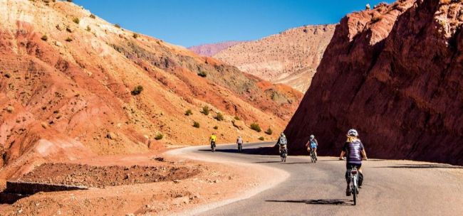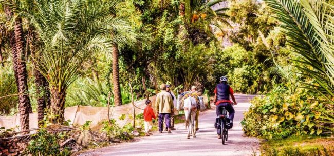 Heute früh stürze ich mich mit meinen Mitreisenden in den Trubel der Medina von Taroudant. Dann brechen wir mit unseren Begleitfahrzeugen zum Mnizla-Pass am Westende des Hohen Atlas (nahe Agadir) auf. Auf unseren Rädern geht es heute insgesamt 21 km hoch und runter, doch erst einmal hinunter durch grünes Bergland und duftende Wälder rund um den See von Sidi Abdel Moumen. Hier überrascht uns unser Reiseleiter an einem idyllischen Picknickplatz. Wo kommen nur plötzlich all die marokkanischen Köstlichkeiten her? Ein Bustransfer bringt uns bis kurz vor Immouzzer des Ida-Outanane. Dort steigen wir wieder auf unsere elektrischen Drahtesel und radeln insgesamt etwa 31 km durch das spektakuläre Paradise Valley bis nach Agadir. Da hier kaum Verkehr herrscht, genieße ich in aller Ruhe die fabelhaften Ausblicke auf die ockerfarbenen Berge und dramatischen Schluchten. Am Nachmittag belohnt uns ein Sprung in den Atlantik – eine Wohltat für Körper und Geist! Unser Hotel ist nur wenige Gehminuten vom Strand entfernt. (FMA)