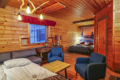 Ausstattung: Komfortable Hotelzimmer im Blockhausstil für 2-3 Personen, Wilderness Plus Zimmer und Suiten mit zusätzlicher Sitzecke für 2-7 Personen, Sauna Zimmer mit privater Sauna für bis zu 5 Personen und Blockhütten direkt am Fluss gelegen ausgestattet mit einem Schlafzimmer, Loft, Wohnbereich, Küchenzeile, Terasse und DU/WC mit privater Sauna. Parkplätze am Hotel, kostenfreies WLAN, 2 Kotas (lappländische Zelte aus Holz) mit 30-50 Plätzen in der Nähe, Damen- und Herrensauna, Wellnessbehandlungen (gegen Gebühr), Außen-Jacuzzis (gegen Gebühr).