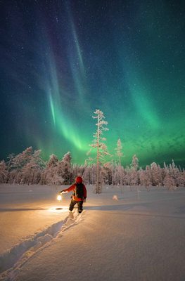 Frühstück und Abendessen im Hotel. Am Abend geht es auf eine sportliche Tour, Sie erkunden die umliegende Natur auf traditionelle Weise auf Schneeschuhen. Suchen Sie nach den bunten Lichtern am Himmel, während Sie die Stille der Umgebung in sich aufnehmen können. Rückkehr und Übernachtung.
