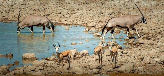 Mit einer weiteren Safari, diesmal in offenen Fahrzeugen, starten Sie in den Tag. An den Wasserlöchern treffen sich Springböcke, Oryxantilopen, Zebras, Gnus, Giraffen und Elefanten. Mit etwas Glück laufen Ihnen gar Löwen, Leoparden und Nashörner vor die Linse. (FMA)