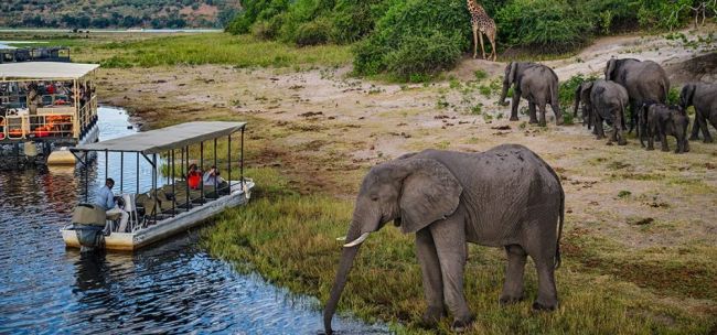Vormittags erleben Sie die reiche Tierwelt auf einer Safari in offenen Fahrzeugen und treffen dabei sicher auf zahlreiche Elefanten. Später geht es per Boot hinaus auf den Fluss, bis die Sonne über dem Chobe versinkt. Jetzt sind Sie im Refugium der Krokodile und Flusspferde. Andere Wildtiere stehen am Ufer Spalier, um in den kühleren Stunden ihren Durst zu stillen. (FMA)