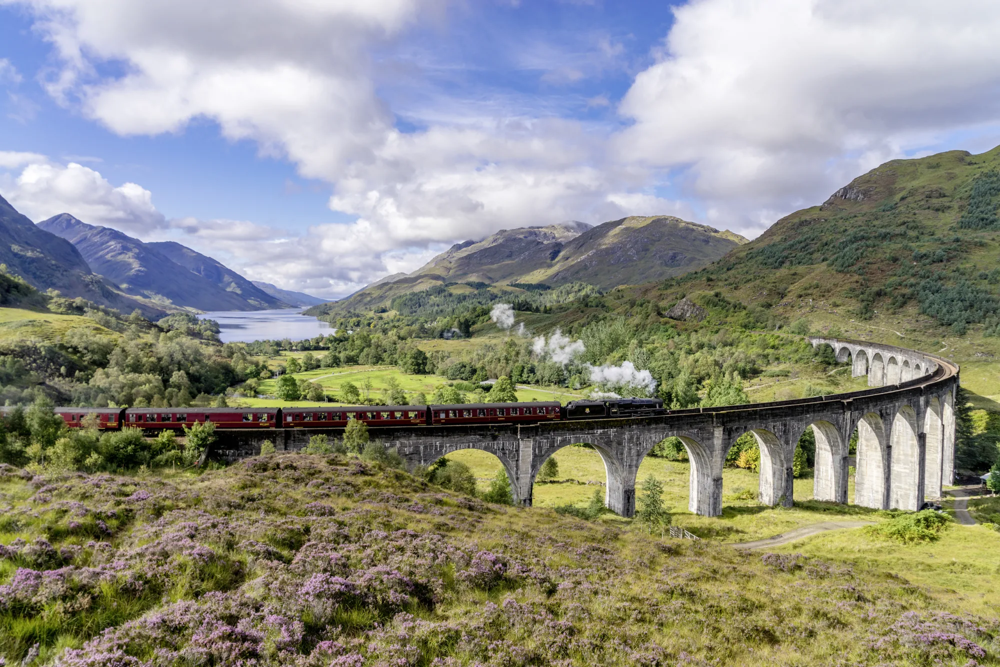 Unternehmen Sie eine Bahnfahrt mit dem Jacobite Dampfzug (voraussichtlich buchbar ab Dezember 2025). Alternativ können Sie mit der regulären Bahn nach Glenfinnan fahren und dort wandern, eine Bootstour unternehmen und das imposante Viadukt bewundern.