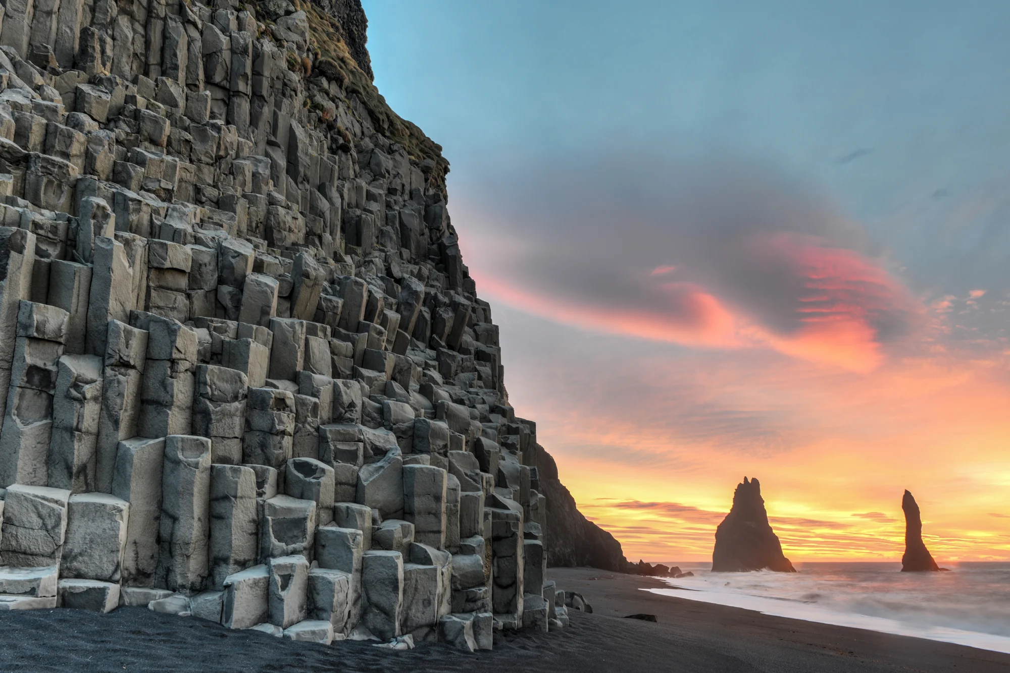 Am Morgen können Sie eine spannende Lavahöhlentour unternehmen (optional zubuchbar). Im Winter entstehen am Eingang der Höhle spektakuläre Eisszapfen, die den Besuch zu einem atemberaubenden Erlebnis machen. Die Erkundung der Südküste beginnt mit einem Stopp am beeindruckenden Seljalandsfoss-Wasserfall, hinter dem Sie hinter einem herabstürzenden Wasserschleier entlanglaufen können. Ihre Reise führt Sie weiter zum imposanten Wasserfall Skogafoss, der ca. 60 m in die Tiefe stürzt. Über die Ringstraße fahren Sie weiter Richtung Vik, den südlichsten Zipfel Island. Von hier aus ist es nicht mehr weit bis zum Gletschervulkan Katla, einem der ältesten und zugleich größten Vulkane des Landes. Die Lage Viks ist einzigartig. Besonders sehenswert ist der bekannte schwarze Lavastrand Reynisfjara. Nur einen Fußweg entfernt sind die berühmten Basaltsäulen Reynisdrangar zu finden, die die raue Schönheit der isländischen Küste zum Vorschein bringt. Auf dem Rückweg können Sie die Gelegenheit nutzen am Skogar Freilichtmuseum in der Nähe des Skogafoss zu halten und Einblicke in die Kultur und reiche Geschichte zu bekommen. Im Skogar Freilichtmuseum finden Sie eine informative Ausstellung, historische Gebäude und traditionelle Artefakte.