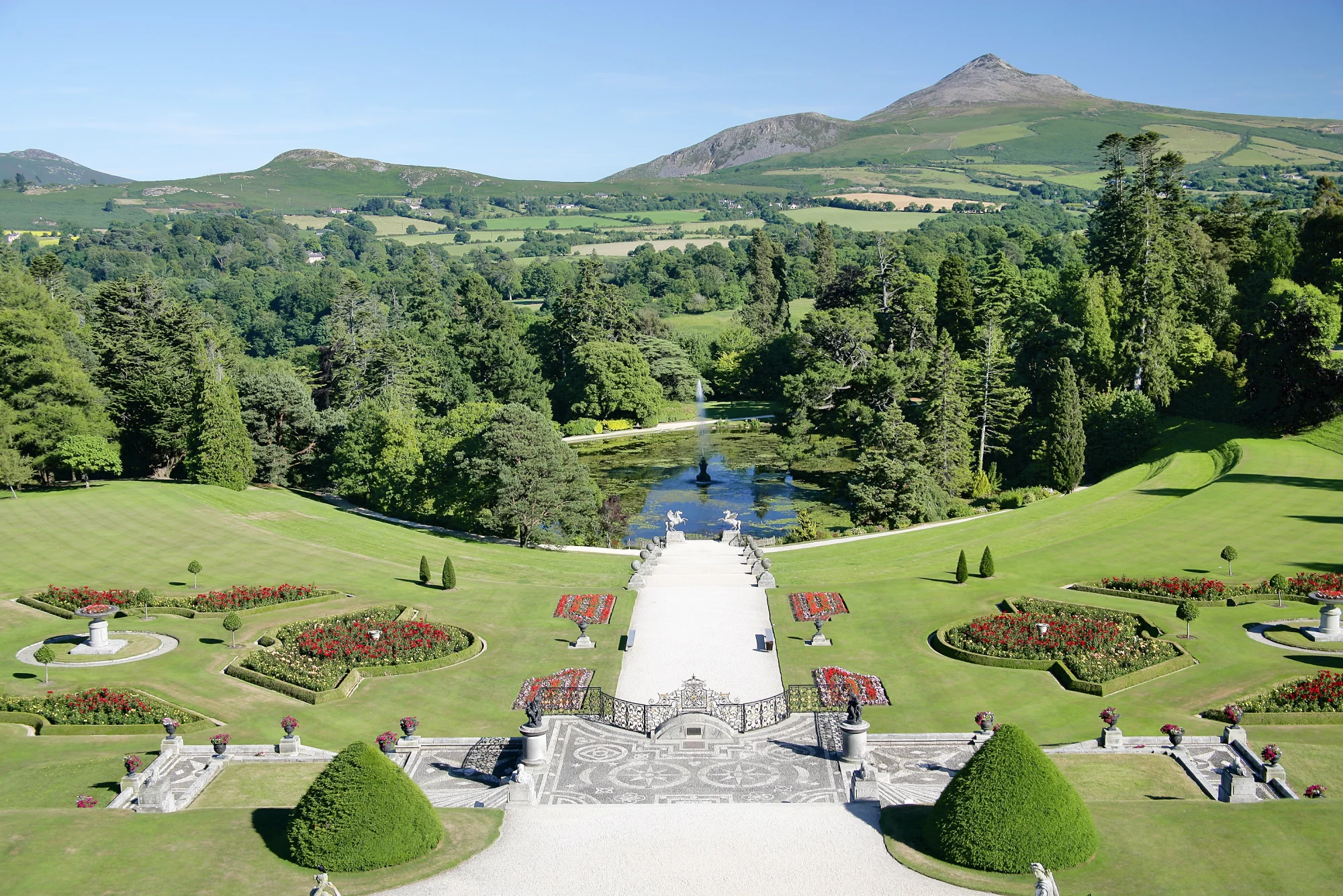 Beim Durchqueren der Berglandschaft der Wicklow Mountains sollten Sie sich Zeit für die Erkundung der einstigen Klostersiedlung Glendalough und der prachtvollen Powerscourt Gardens nehmen.