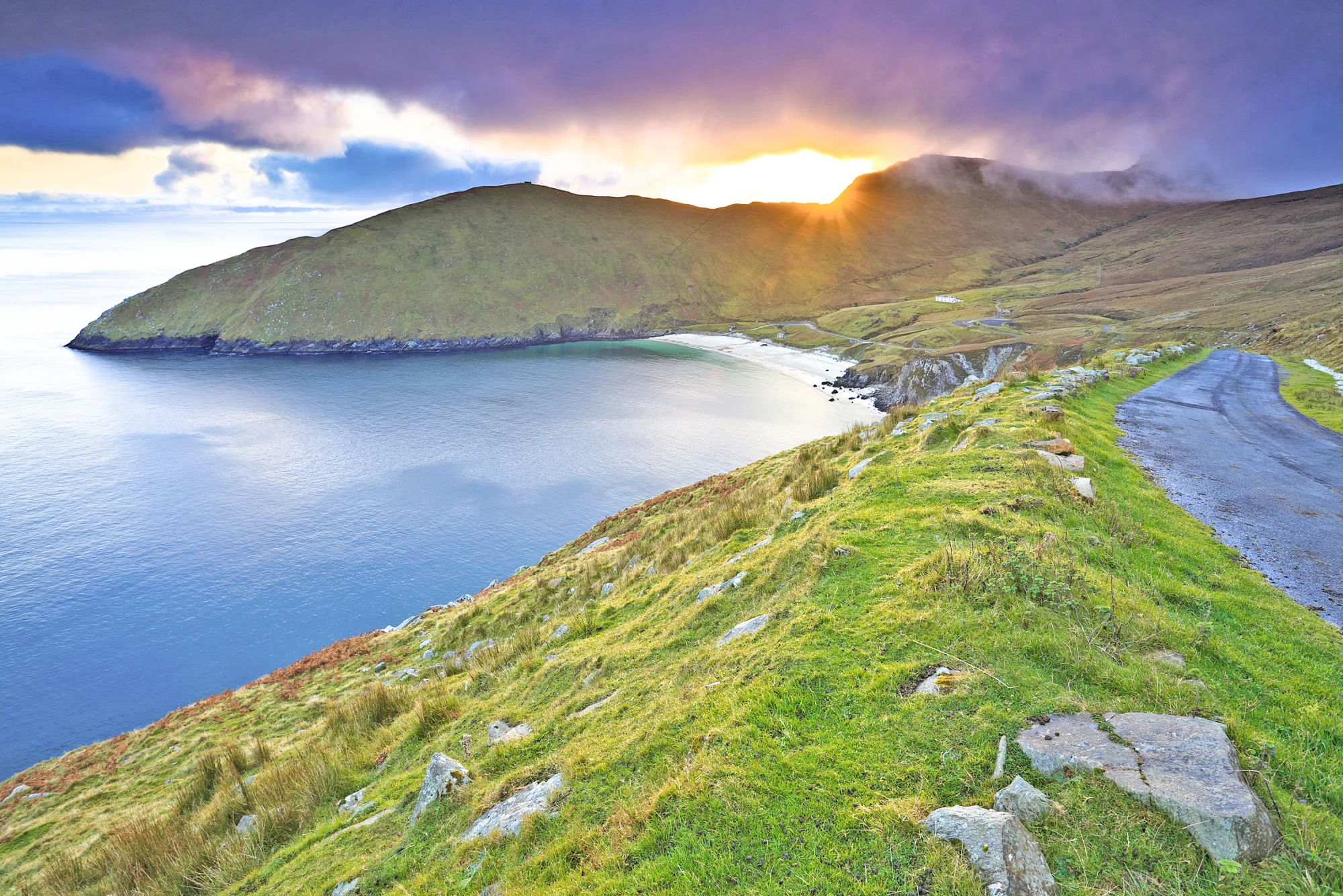 Die Insel Achill Island, mit ihrer Strand-, Heide und Torflandschaft umgeben von rauer Küste, zeigt Ihnen typisch irische Landschaft und den Wild Atlantic Way. An der Spitze der Insel befindet sich der weiße, hufeisenförmige Sandstrand Keem Bay.