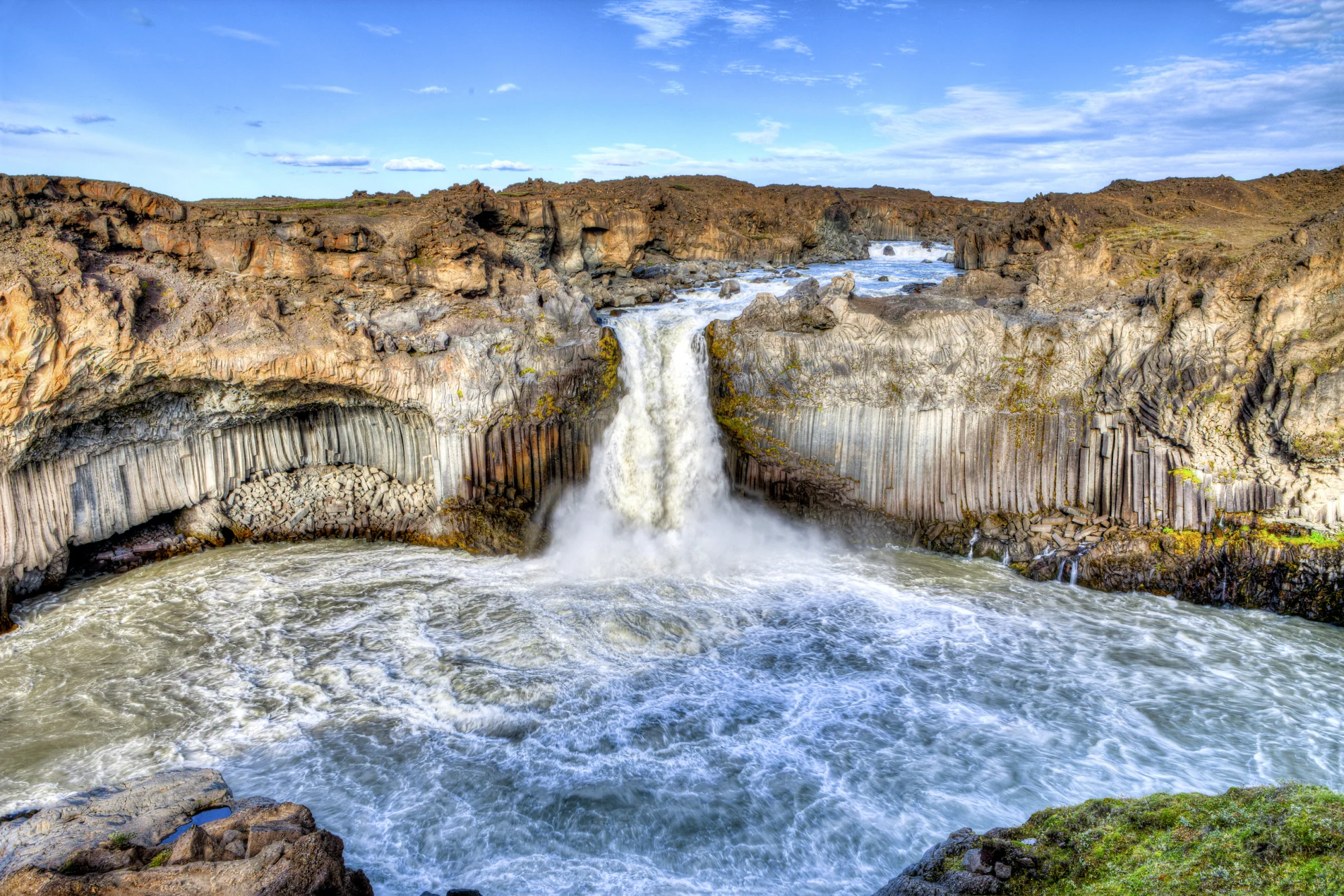Eine abenteuerliche Fahrt führt Sie durch das karge Hochland. Sie führt Sie über die Hochlandpiste Sprengisandur, die mit ca. 200 km die längste Islands ist und durch die umliegenden Lava- und Aschewüsten beeindruckt. Halten Sie während Ihrer Fahrt am Aldeyjarfoss mit seinen beeindruckenden Basaltsäulen. Der Wasserfall wird vom mächtigen Gletscher Vatnajökull gespeist und stürzt über zwei Hauptstufen in eine tiefe Schlucht. Weiter auf der Hochlandstraße führt der Weg Sie in das Hekla-Gebiet. Der Hekla ist einer der aktivsten Vulkane der Insel und wird mit einer Höhe von 1.491 m oft als „Königin der Vulkane“ bezeichnet. In der Region finden Sie auch immer einige heiße Quellen und warme natürlich Pools in denen sich prima entspannen lässt.