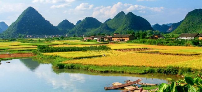 Der Tag beginnt mit einer gemütlichen Fahrradfahrt durch die beeindruckende Umgebung. Vorbei an Reisfeldern und Wildblumenwiesen erhältst du einen Eindruck vom ländlichen China. Bauern, die Reis ernten oder ihn am Wegesrand trocknen, sind typische Begegnungen während der entspannten Tour. Anschließend treibst du mit einem Bambusfloß etwa eine bis eineinhalb Stunden gemütlich und ganz traditionell auf dem Yulong-Fluss durch eine einzigartige Landschaft, vorbei an den bizarren Karstkegelbergen Guilins.