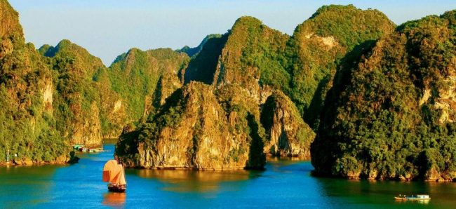 Du fährst weiter nach Halong-Stadt, wo du gegen Mittag an Bord einer Dschunke gehst. Als Höhepunkt des Tages gleitest du mit dem sogenannten Drachenboot durch die berühmte Halong-Bucht, die sich durch ihre einzigartige Schönheit auszeichnet und von der UNESCO zum Weltnaturerbe erklärt wurde. Eine Legende besagt, dass die unzähligen Inseln und Felsen, die hier zum Teil mehrere Hundert Meter hoch aus dem Wasser ragen, einst von einem riesigen Drachen erschaffen wurden, der bei seinem Einsatz, das Land zu verteidigen, tiefe Furchen mit seinem Schwanz in den Boden schlug, die später mit Wasser gefüllt wurden, als der Drache ins Meer hinabtauchte. Da ergibt auf einmal der Name der Bucht einen Sinn - Ha Long bedeutet so viel wie »untertauchender Drache«. Abends wird an einer der Buchten geankert. Genieße die atemberaubend schöne Kulisse und lass den Tag gemütlich auf dem Sonnendeck ausklingen. Wenn es die Situation erlaubt, setzt sich der Kapitän am Abend zu dir an den Tisch und erzählt von seinen Erlebnissen in der Halong-Bucht.