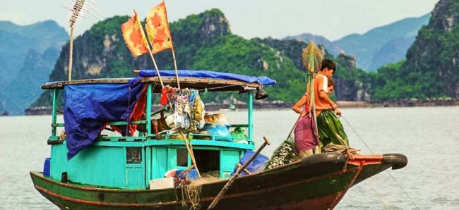 Unternimm am späten Nachmittag eine kurze Kajaktour durch die Halong-Bucht und du siehst mit ein wenig Glück den Fischerinnen und Fischern bei der Arbeit zu. Die Kajaktour ist für dich kostenlos.