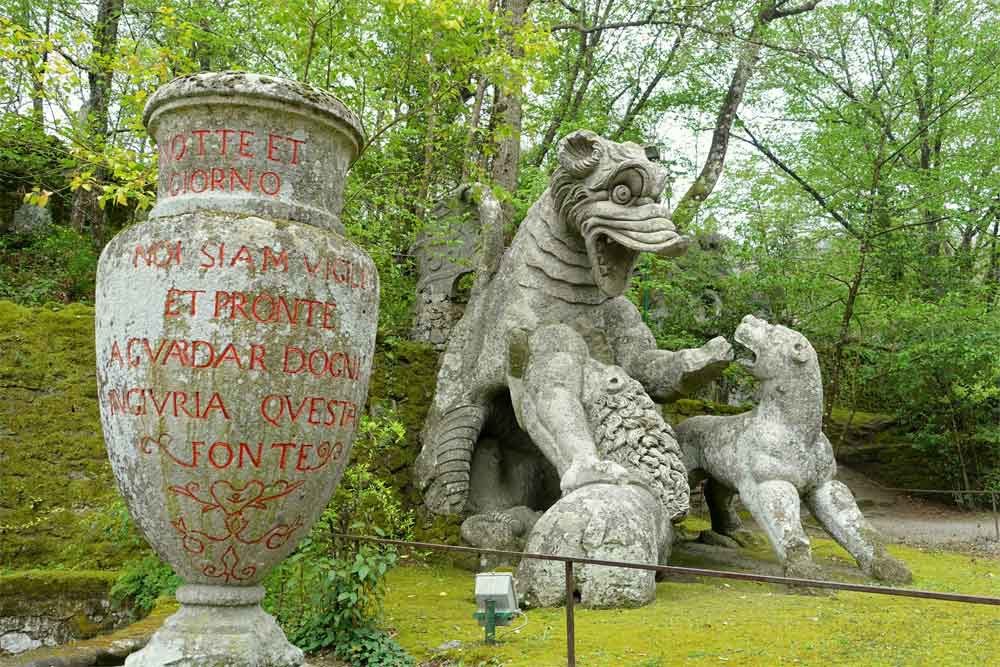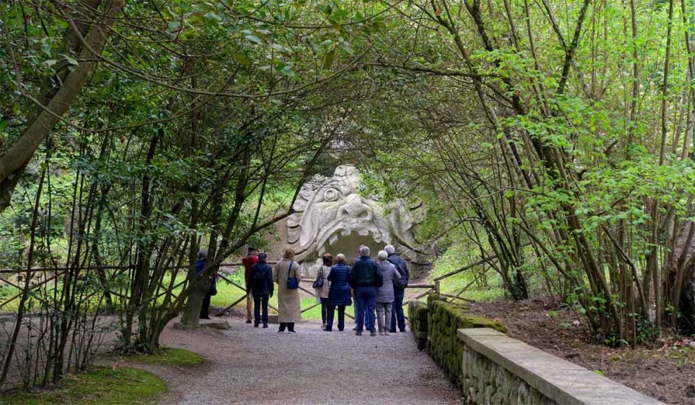 Am Morgen geht es mit dem Kleinbus von Rom in Richtung Toskana. Noch bevor wir die Provinz erreichen, machen wir einen Stopp beim „Sacro Bosco“, wörtlich übersetzt der „Heiligen Hain“ von Bomarzo. Bekannt ist das Areal jedoch auch als „Park der Ungeheuer“, denn zu sehen gibt es hier einen manieristischen Garten mit groteske Monumentalskulpturen und rätselhaften Architekturen. Ein lokaler Feudalherr erträumte diesen Ort im 16. Jhdt., doch nach dessen Tod 1585 geriet der Park in Vergessenheit. Erst in den 1930ern wurde er wieder entdeckt - u.a. von Salvador Dalí.