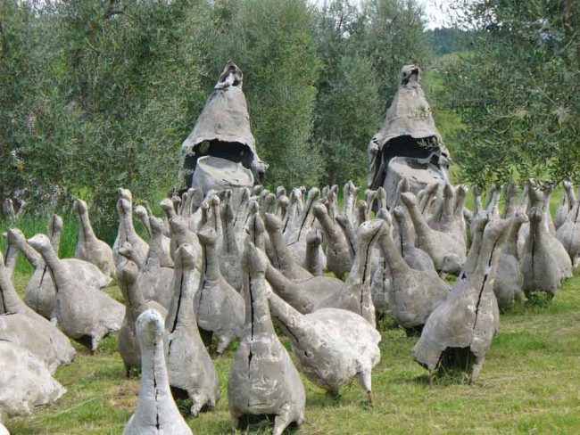 Dabei ist der Tarotgarten bei weitem nicht der einzige Künstlerpark in der Region. Auch Daniel Spoerri – der Pionier der Eat Art – hat sich hier verweigt: Im Landesinneren, mitten in der Hügellandschaft der Toskana stößt man auf eine umfangreiche Sammlung des Schweizer Künstlers. Sie ist verteilt auf 16 Hektar Land, auf dem zusätzlich Skulpturen und teils verspielte Objekte von rund 50 weiteren Künstlern präsentiert werden. Auf schmalen Wegen geht es durch Wiesen, über leichte Hügel oder durch kleine Waldflecken – und man stößt immer wieder auf Skulpturen.