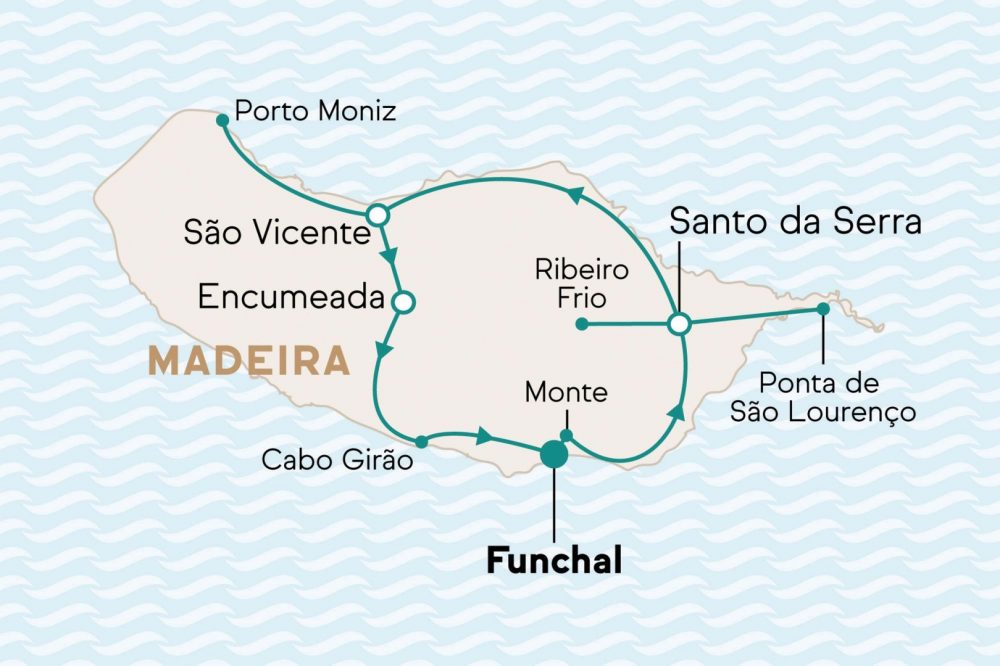 7 Übernachtungen/Frühstück: 2x PortoBay Serra Golf, Santo da Serra; 3x Estalagem do Vale, São Vicente; 1x Valley View Hotel Encumeada, Encumeada; 1x Quinta da Bela Vista, Funchal
