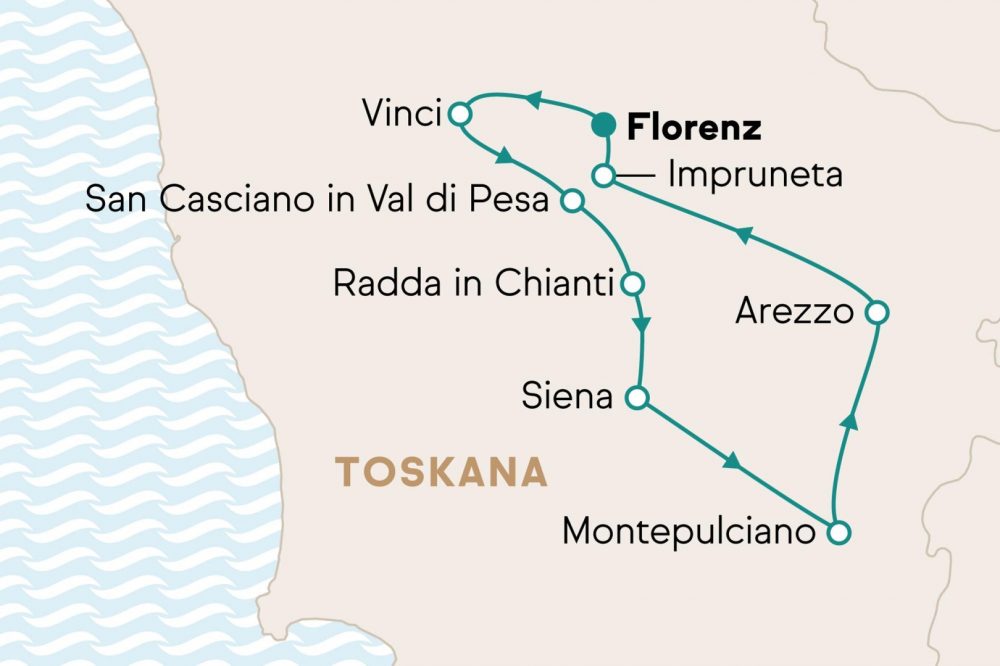 7 Übernachtungen mit Frühstück in Weingütern oder Wein-Resorts: 2x Fattoria La Torre, Montecarlo/Lucca; 2x Hotel San Niccolo, Radda in Chianti; 2x Borgo Tre Rose, bei Montepulciano; 1x Villa Pitiana, Donnini bei Reggello