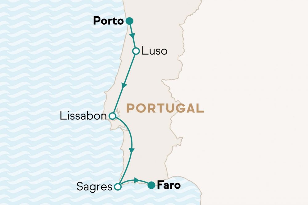 9 Übernachtungen/Frühstück: 2x HF Ipanema Park, Porto; 1x Grande Hotel de Luso, Luso; 3x HF Fénix Urban, Lissabon; 3x Memmo Baleeira Hotel, Sagres