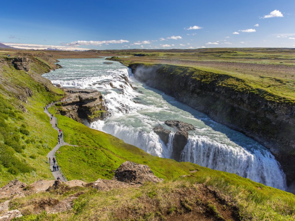 - Einer der schönsten Wasserfälle Islands ist der Gullfoss, hier stürzt der Fluss Hvitá 32 Meter tief in eine 2,5 Kilometer lange Schlucht.