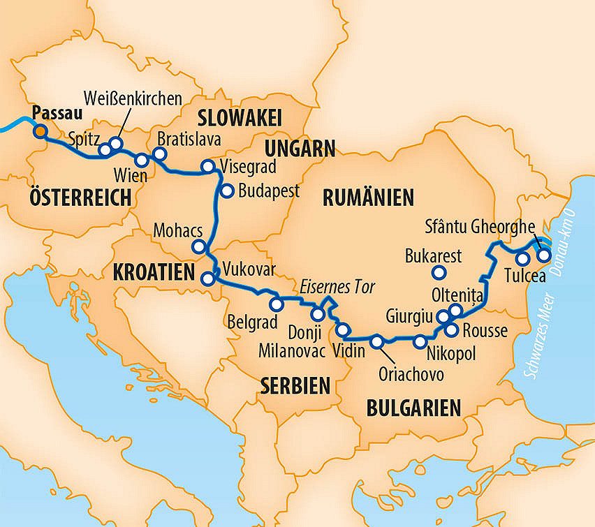 Der Traum eines jeden Flusskreuzfahrtenliebhabers: die Donau in ihrer ganzen Pracht von Passau bis zum Delta erleben. Diese 17-tägige Reise macht es uns möglich und führt uns durch acht Länder und fünf Hauptstädte. Wir erleben faszinierende Flusslandschaften, wie die Wachau und das „Eiserne Tor“, ein Durchbruchstal an der Donau und können eine Bootsfahrt ins rumänische Donaudelta am Schwarzen Meer unternehmen.