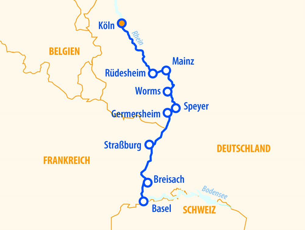 Von Köln bis Basel kreuzen wir auf dem „Vater Rhein" durch das Mittelrheintal mit seinen Ritterburgen, Weinbergen und Winzerstädtchen. Diese romantische Flussfahrt führt uns in die Europastadt Straßburg und das schweizerische Basel. An Bord lassen wir uns mit der 1AVista ALL INCLUSIVE-Verpflegung verwöhnen und genießen die Aussicht. Nach einer Woche geht die Drei-Länder-Flusskreuzfahrt in Köln zu Ende.