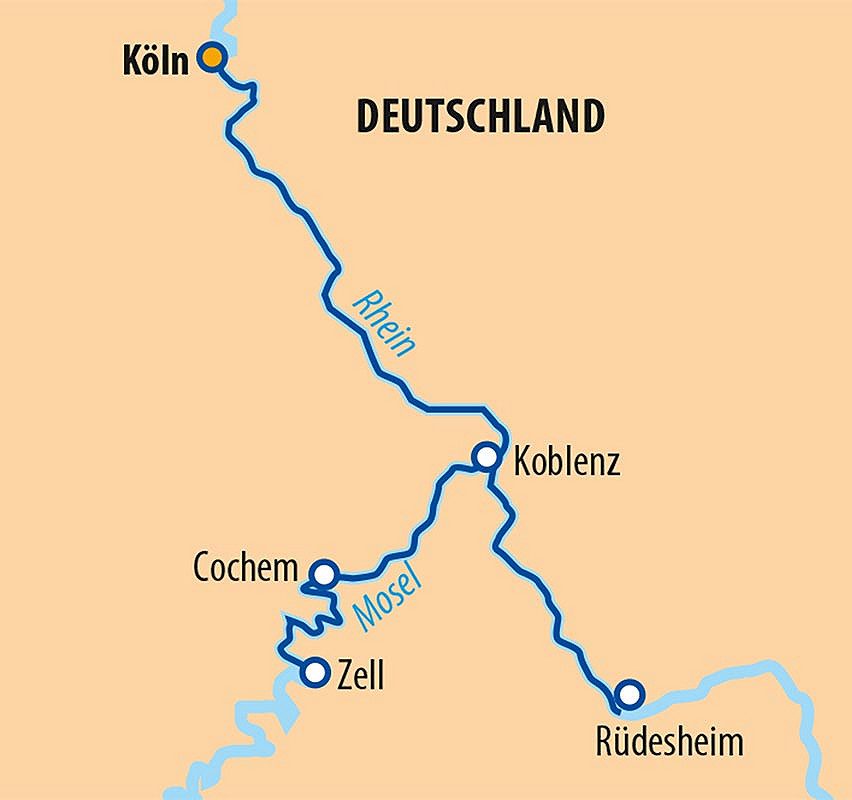 Während unserer Rhein- & Moselzauber Reise im Herbst befinden wir uns zwischen Burgen und Weinbergen auf dem Rhein. Neben Rüdesheim, Cochem und Zell erreichen wir auch Koblenz – wo Rhein auf Mosel trifft. Herzlich Willkommen an Bord!