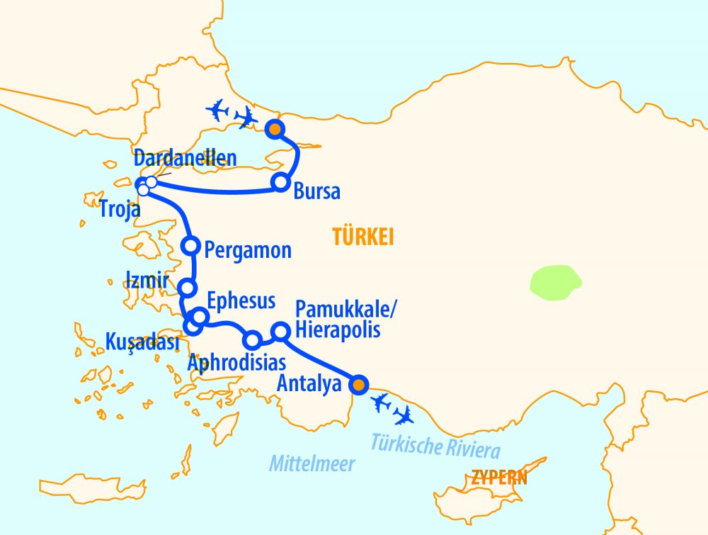 Unsere Reise führt uns von Istanbul entlang der Westküste bis hin nach Antalya. In Istanbul lassen wir uns von der über 15 Millionen Einwohner Stadt beeindrucken und lernen die die Gastfreundlichkeit dieser modernen Metropole kennen. Das Zusammenspiel von moderner Großstadt und Zeugen der Antike ist etwas ganz Besonderes. Alte Ruinenstädte wie Troja, Pergamon und Ephesus lassen uns tief in die Vergangenheit blicken. Ein weiteres Highlight dieser Reise ist Pamukkale mit seinen weißen Sinterterrassen, welches kurz vor Ende der Reise einen runden Abschluss liefert.