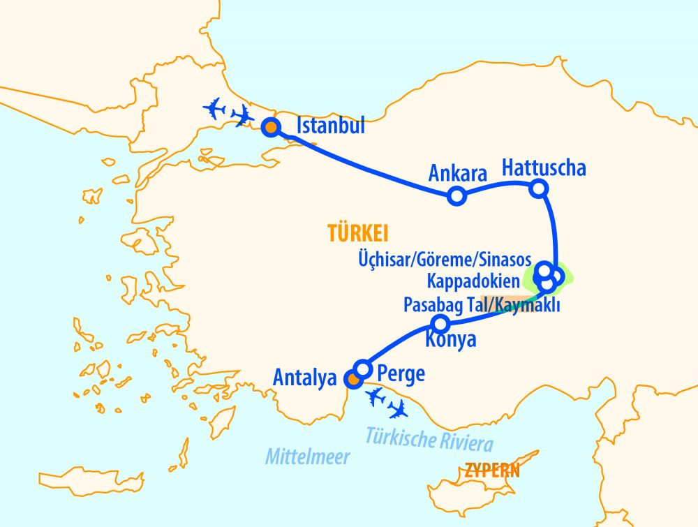 Wir besuchen die Stadt der tanzenden Derwische, Konya und erleben das Wunderland Kappadokien mit Feenkaminen, unterirdischen Städten und Höhlenkirchen. Wir besuchen die Reste der fast 4.000 Jahre alten Ausgrabungen in Hattuscha, Hauptstadt des Hethiter-Reiches. Dann erwarten uns die Hauptstadt Ankara und die Metropole auf 2 Kontinenten Istanbul. Eine wundervoll abwechslungsreiche Reise.