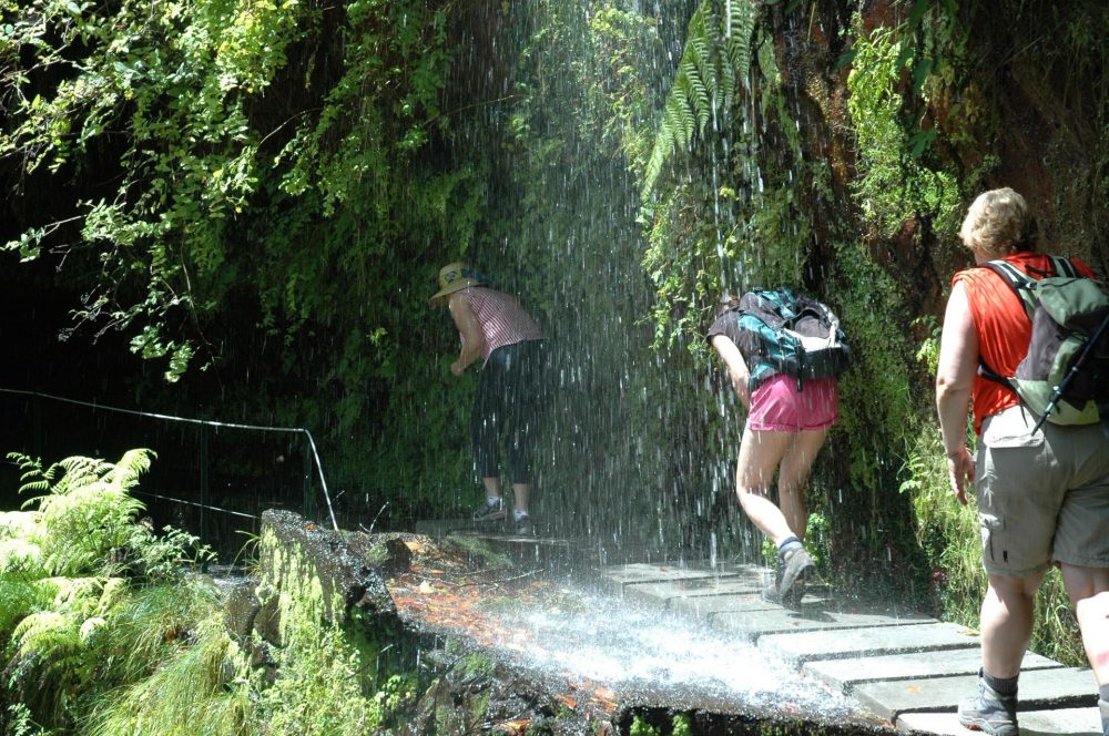 Über einen schönen Waldweg, durchsetzt mit kleinen Tunneln und geschützten Übergängen, geht es hinab in den "Grünen Kessel" Caldeirão Verde. Das immer präsente Wasser schuf eine dichte Vegetation, an dessen Ende Sie ein schwindelerregender Wasserfall erwartet, der sich in einen kristallklaren Teich stürzt. Je nach Wetterbedingung steigen Sie weiter hinunter auf einer der abenteuerlichsten Levadarouten der Insel. Hier wird gewahr, welche Mühen und Aufwand es gekostet haben mag, den Wasserkanal in diese wilde Landschaft zu legen. Im Höllenkessel "Caldeirão Inferno" schafft es kaum ein Lichtstrahl durch das dichte grüne Blattwerk und Sie genießen die Ruhe an diesem mystischen Ort.