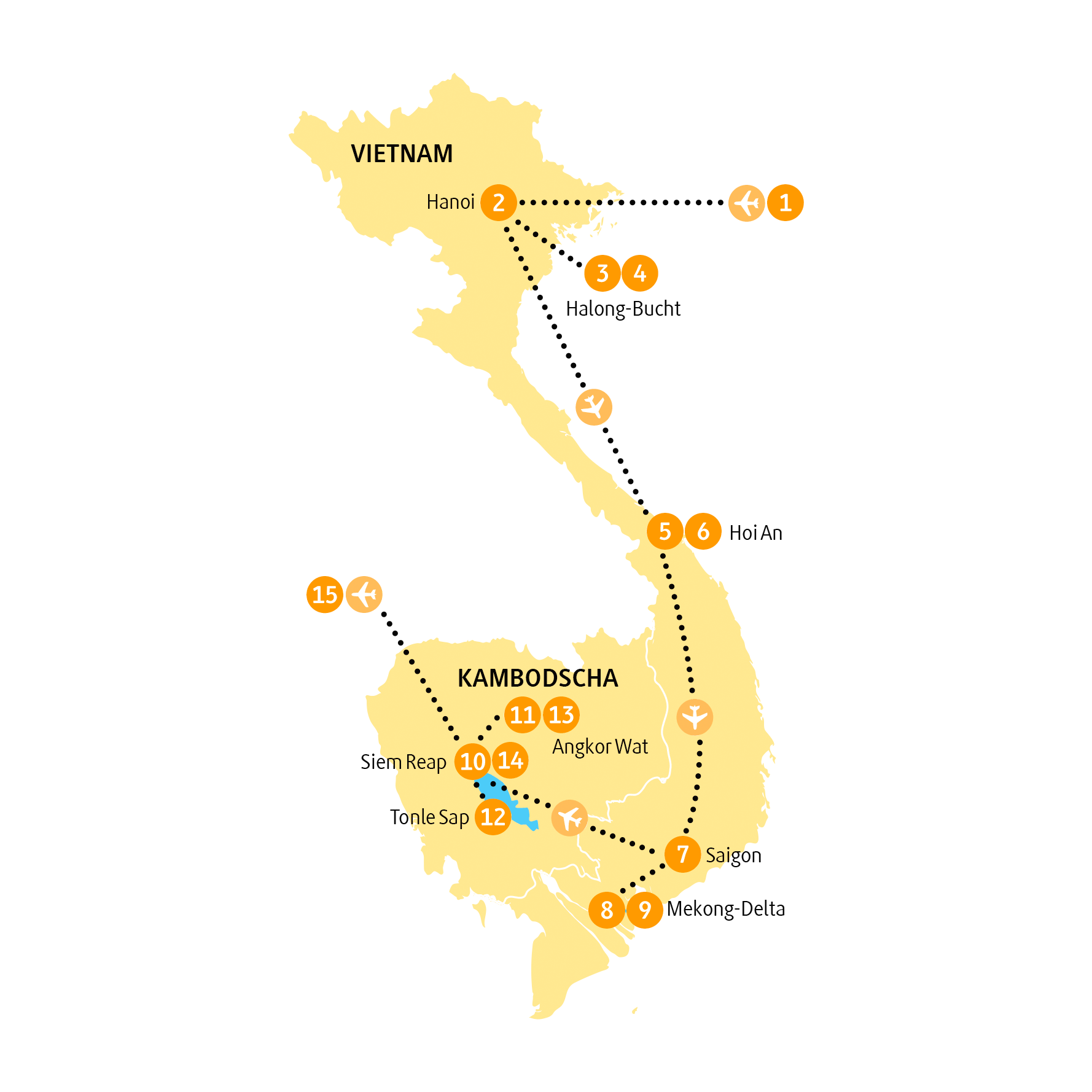 Wenn du dir einmal die Frage stellen möchtest: »Was soll jetzt eigentlich noch kommen?«, dann mach diese Reise. Das Beben deiner Gefühlswelt beginnt zwischen den 1.969 Zipfelmützen der Halong-Bucht und geht unter den zigtausend Lampions des Weltkulturerbes Hoi An in eine neue Runde. Das Mekong-Delta trägt zur Beruhigung deiner Nerven absolut nichts bei, und solltest du auf die Wunder Banteay Srei, Bayon, Angkor Thom und Angkor Wat hoffen, liegst du so wat von daneben. Unglaublich.