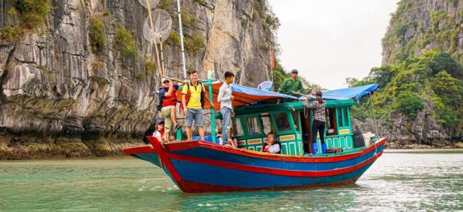 Unternimm am späten Nachmittag eine kurze Kajaktour durch die Halong-Bucht und du siehst mit ein wenig Glück den Einheimischen beim Fischen zu. Die Kajaktour ist für dich kostenlos.