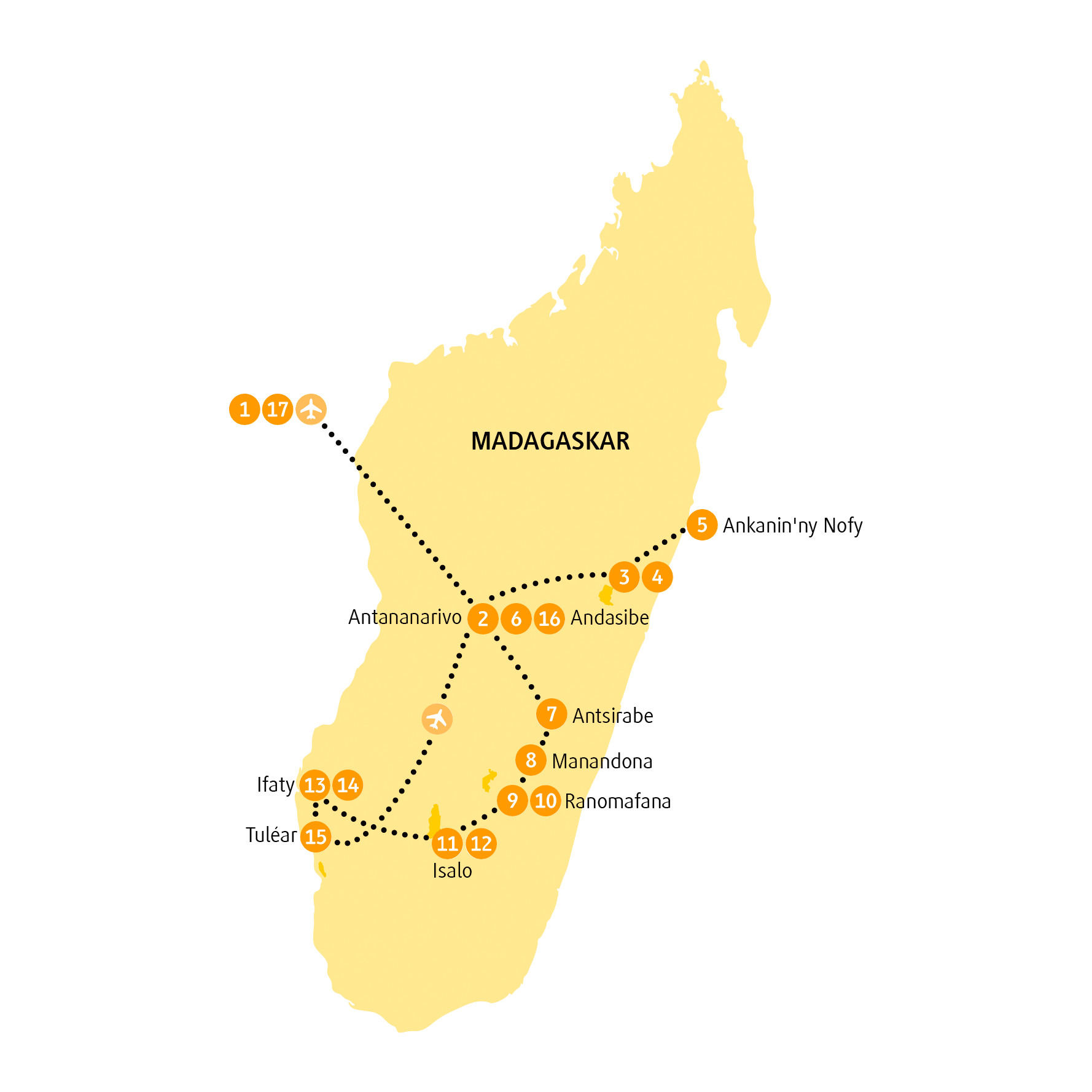 Nicht selten kommt es zu kurzfristigen Änderungen der Flugpläne von Air Madagascar. In Ausnahmefällen kann es auch einen Zwischenstopp in Tolagnaro (Fort Dauphin) geben. Unsere madagassische Partneragentur fragt jedoch täglich die aktuellen Flugzeiten ab, sodass du deinen Flug nach Antananarivo auf jeden Fall pünktlich erreichst. Der momentane Reiseverlauf wurde auf der Grundlage eines Abflugs am frühen Morgen geplant. Sollte der Flug auf den Nachmittag fallen, besichtigst du am Vormittag Tuléar.