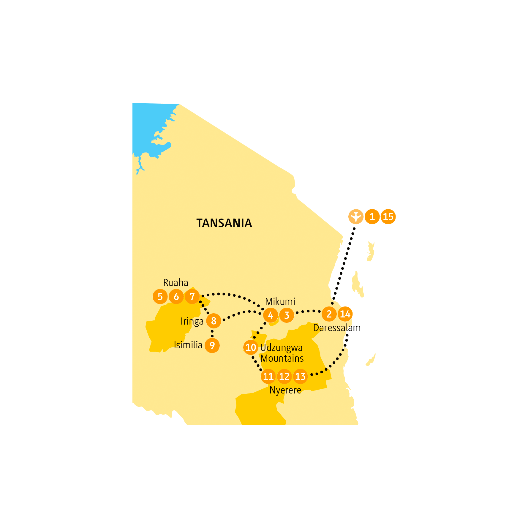 Genieße zum letzten Mal für diese Reise das Frühstück unter der warmen Sonne Afrikas. Leider heißt es dann Abschied nehmen, du fährst in Richtung Indischer Ozean und wirst zum Flughafen von Daressalam gebracht, von wo du zurück nach Hause fliegst.