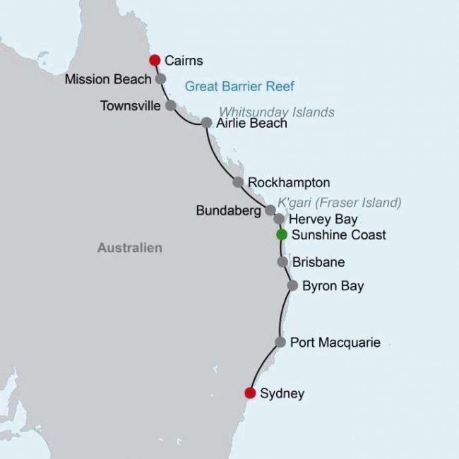 Vom tropischen Cairns reisen Sie durch die abwechslungsreichen Landschaften entlang der australischen Ostküste bis zu der faszinierenden Metropole Sydney. Auf Ihrem Programm stehen viele Highlights wie Byron Bay und K‘gari.