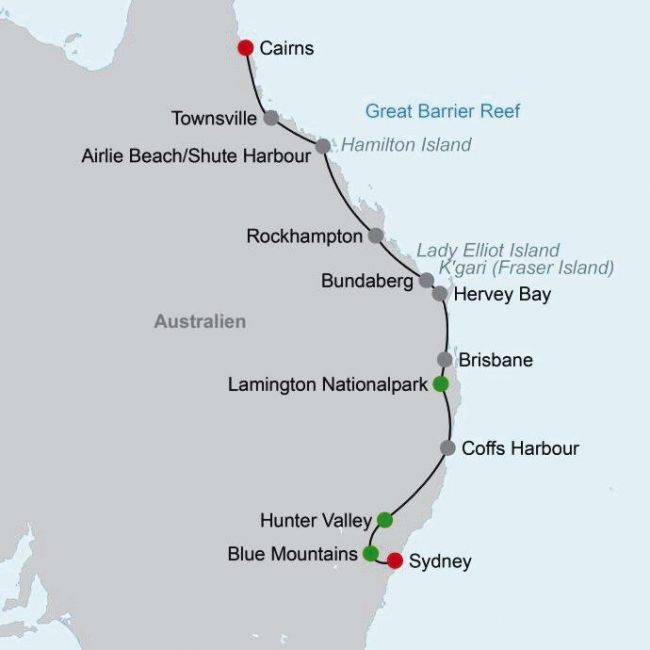 Blue Mountains, Hunter Valley, Lamington Nationalpark, K'Gari Island, Great Barrier Reef, Whitsunday Islands, Cairns
