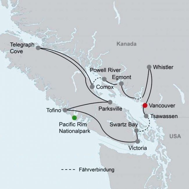 - Am 7. Tag nehmen Sie bitte die Fähre um 8 Uhr morgens von Earls Cove nach Saltery Bay, da ansonsten die Weiterreise mit der Fähre am gleichen Tag von Powel River nach Comox nicht gewährleistet ist.