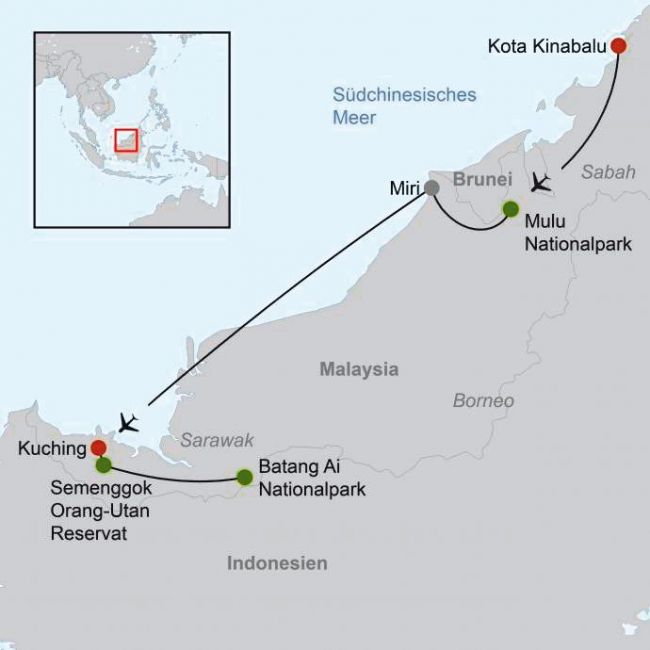 - Auch buchbar in umgekehrter Richtung ab Kuching/bis Kota Kinabalu. Anreise in Kuching am 1. Tag bis 12 Uhr und Ende der Reise in Kota Kinabalu am 9. Tag am Flughafen. Anf R, Leistung KCH50757B (Standard-Variante: UG1X ab 2 Pers. pro Buchung, UG2X Alleinreisender) bzw. (Superior-Variante: US1X ab 2 Pers. pro Buchung, US2X Alleinreisender).