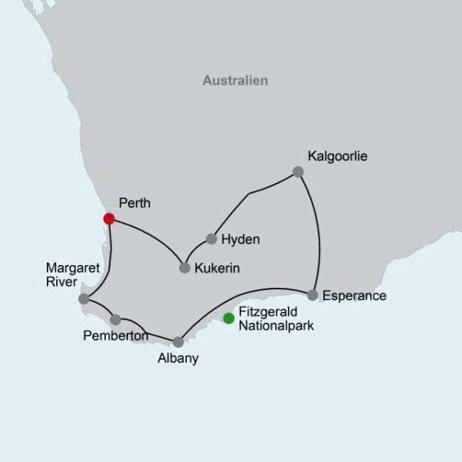 Perth, Margaret River, Fitzgerald Nationalpark, Esperance, Kalgoorlie, Wave Rock, Kukerin