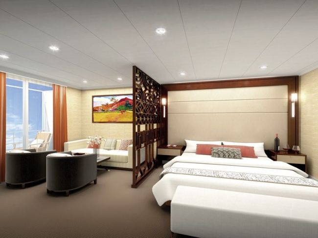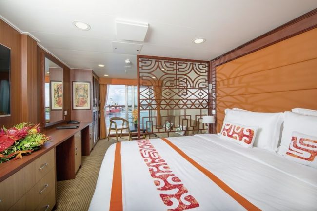 Schlafsaal: mit Bullauge und zweistöckigen Etagenbetten, abschließbaren Fächern, nicht nach Geschlechtern getrennt, Gemeinschaftsdusche und -WC, Klimaanlage (KH1X).Standard Cabin: ca. 11 qm, Außenkabine, ein Bullauge, Dusche/WC, TV, Klimaanlage, Safe (KH2X).Standard Cabin mit eingeschränkter Aussicht: (KH3X).Deluxe Cabin: ca. 13 qm, Ausstattung wie Standard Cabin, mit Föhn, Kühlschrank, 4 qm Balkon (KH4X).Superior Deluxe Cabin: ca. 14,5 qm, Ausstattung wie Deluxe Cabin (KH5X).Junior Suite: ca. 19 qm, Ausstattung wie Superior Deluxe Cabin, mit Sofa, teilweise mit Balkon (KS1X). Premium Suite: ca. 19 qm, Ausstattung wie Junior Suite, mit 4 qm Balkon (KS2X).Royal Suite: ca. 22 qm, Ausstattung wie Premium Suite, mit Ankleidezimmer und 9,5 qm großen Balkon (KS3X).Royal Suite mit eingeschränkter Aussicht: (KS4X).Presidential Suite: ca. 41 qm, Ausstattung wie Royal Suite, mit 3 Räumen und 12 qm Balkon (KS5X).