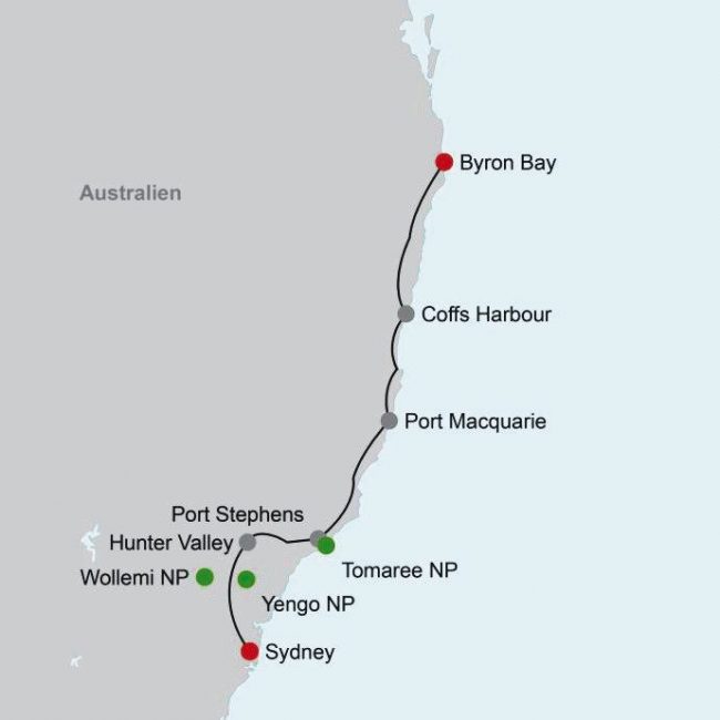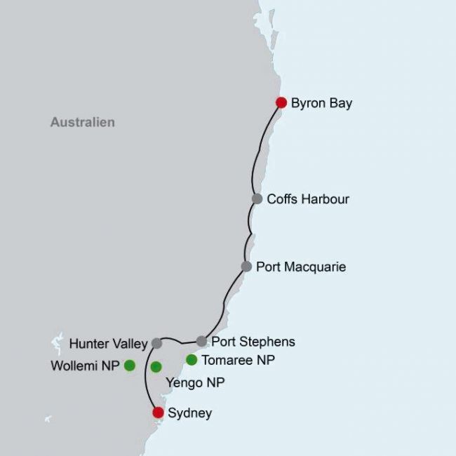 Sydney, Hunter Valley, Port Stephens, Port Macquarie, Coffs Harbour, Byron Bay