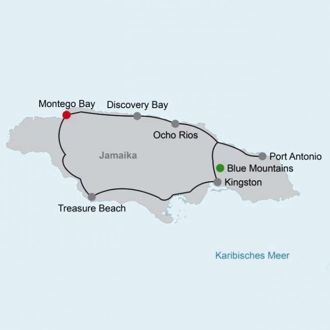 Montego Bay, Ocho Rios, Port Antonio, Blue Mountains, Kingston, Treasure Beach