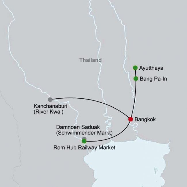 Von Bangkok aus entdecken Sie bei spannenden Tagesausflügen die Highlights der Umgebung. Es geht zu den Schwimmenden Märkten von Damnoen Saduak, nach Kanchanaburi, zur Brücke am Kwai sowie nach Ayutthaya, in die ehemalige Hauptstadt Siams.