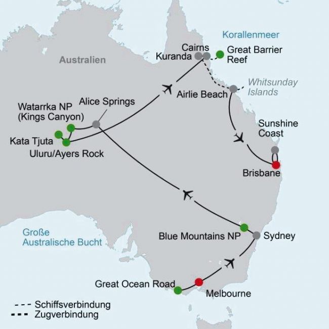 Diese vielfätlige Reise durch die Metropolen Melbourne und Sydney bis hin zum Roten Zentrum und weiter an die faszinierende Ostküste werden Sie nicht so schnell vergessen! Sie erleben u. a. die Blue Mountains, ein Sonnenaufgang am Uluru, das wundersame Great Barrier Reef, die Sunshine Coast u. v. m.