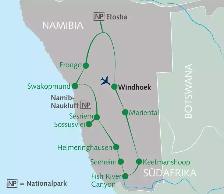 Wie wäre es mit einer Auszeit in Afrika? Namibias Wildnis vermittelt ein unbeschreiblich schönes Gefühl von Weite und Freiheit. Auf meist leichten Wanderungen erkunden wir die Vielfalt der Landschaft – von den tiefen Schluchten des Fish River Canyons bis zu den höchsten Dünen der Namib-Wüste. Der Geschichte des Landes nähern wir uns mit den Felszeichnungen der San. Den Tierreichtum erleben wir auf ausgedehnten Safaris im Etosha-Nationalpark. Genieße deinen Traum von Afrika!