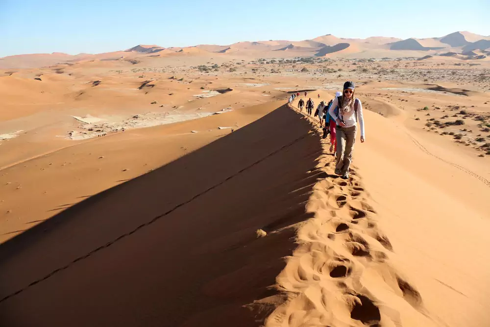 Die wohl schönste Wüste unserer Reise erwartet uns. Die Namib mit ihren hohen Dünen, deren Farben von sattem Gelb zu dunklem Orange changieren und deren Sträucher und Gräser grün-braune Farbakzente setzen. Wir wandern durch die Dünen bis zur weißen Pfanne des Sossusvlei und erkunden den Sesriem-Canyon. GZ ca. 4 Std. und ca. 1 Std. Anschließend machen wir uns auf den Weg nach Helmeringhausen, eine der trockensten Regionen Namibias, in der nur absolute Überlebenskünstler eine Heimat finden. Auf einer Gästefarm lernen wir das Farmleben kennen und genießen am Abend ein leckeres typisches namibisches Essen. Übernachtung auf der Gästefarm im südlichen Namib. 225 km. (F, M, A)
