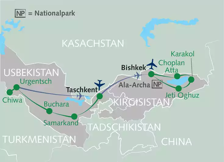Kennst du schon die Perlen der Seidenstraße? Samarkand, Buchara, Chiwa - geheimnisvolle Mythen und Legenden ranken sich um jene Orte, an denen sich die Wege der alten Händler kreuzen. Unser Reiseleiter Kay Tschersich konzentriert sich nicht ausschließlich auf diese Kulturzentren. Wir erschließen auch abgelegene und von Touristen kaum besuchte Naturlandschaften der Bergwelt Kirgisistans. Komm mit uns zu den Geburtsstätten der Märchen aus 1001 Nacht!