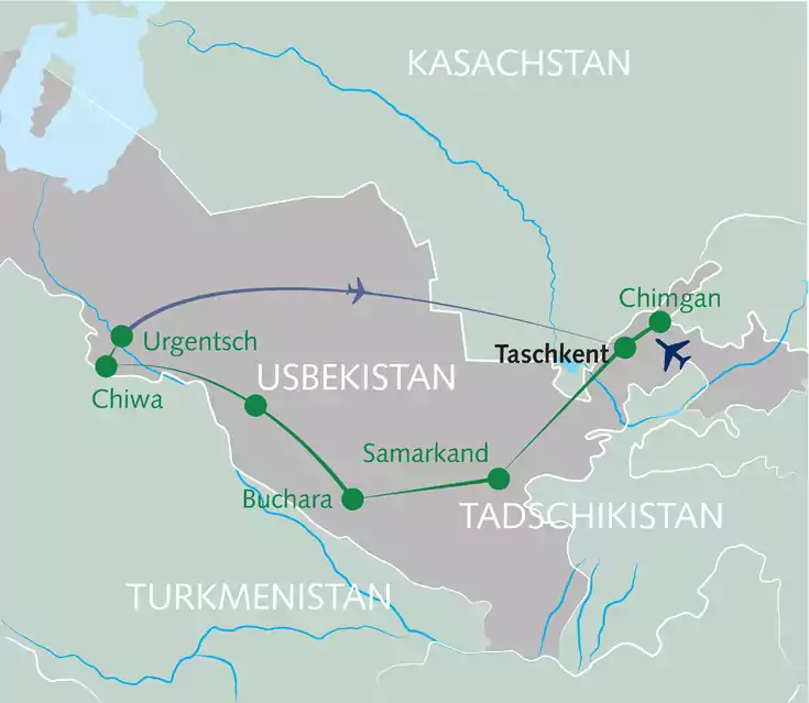 Medresen und Moscheen, Mosaiken und Minarette, der Seidenstraße märchenhafter Charme: Wir reisen entlang der legendären Handelsstraße und bestaunen die architektonischen Wunder Zentralasiens in Samarkand, Buchara und Chiwa. Natürlich kommt auch die Natur bei dieser Reise nicht zu kurz: Die Wanderungen in den Ausläufern des mächtigen Tian-Shan-Gebirges und im Amankutan-Nationalpark geben der Reise einen typisch aktiven Wikinger-Touch. Diesen vollenden wir mit unseren kulinarischen Rendezvous, bei denen wir gemeinsam mit den einheimischen Köchen usbekische Spezialitäten zubereiten. Die Seidenstraße, eine Region voller Höhepunkte. Erlebe selbst den Charme des Orients!