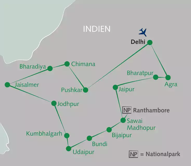 Zauberhaft klingende Maharadscha-Städte: Jaipur, Jodhpur, Udaipur. Prachtvoll emporragende Paläste und das berühmte Taj Mahal – das sind wahre Perlen des exotischen Rajasthan. Auf den Spuren des sagenhaften Bengal-Tigers durchstreifen wir den Ranthambore-Nationalpark. Zu Fuß besuchen wir nahezu unberührte Dörfer in der sanften Hügellandschaft von Aravalli. Auf dem Rücken von Kamelen durchstreifen wir die legendäre Wüste Thar. Geradezu märchenhaft erstrahlt schließlich Jaisalmer vor unseren Augen – stolz und unwirklich wie eine Fata Morgana. Die Farben, die Düfte, die freundlichen Menschen runden unser Erlebnis ab. Komm mit und erlebe den Zauber Rajasthans hautnah!