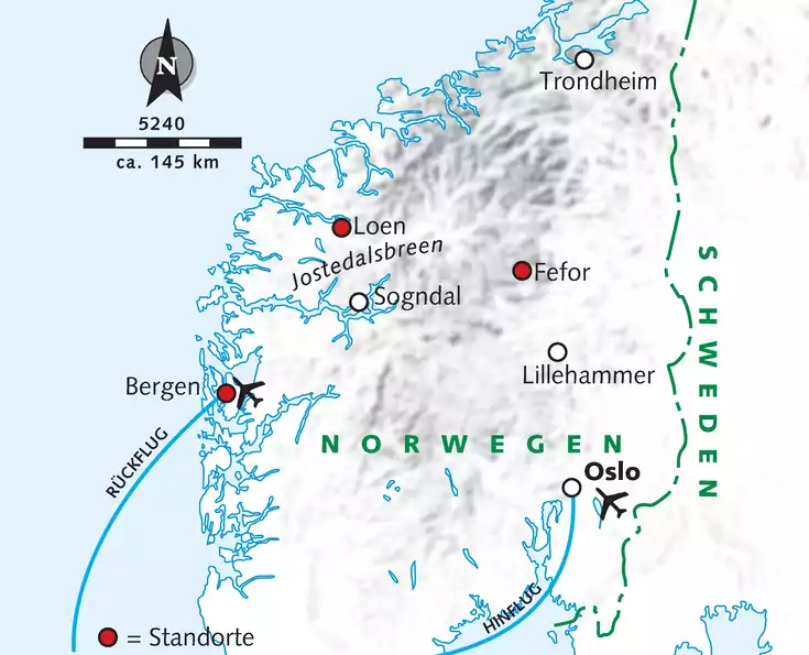 Im Herzen des Gudbrandsdalen liegt die kleine Ortschaft Fefor, idealer Ausgangspunkt für Touren auf den Fjells und in den "Bilderbuchgebirgen" der Rondane im Osten. Im Westen Norwegens begeistern dagegen die Bergwelt des Jotunheimen, die traumhafte Fjordlandschaft mit schroffen, bewaldeten Hängen, die sich im Wasser spiegeln, und der Jostedalsbreen, der größte Gletscher des europäischen Festlandes. Inmitten dieser grandiosen Landschaft liegt der kleine Ort Loen, Standort unserer zweiten Aktivwoche. Abschluss unserer Reise ist die legendäre Hanse- und Handelsstadt Bergen.
