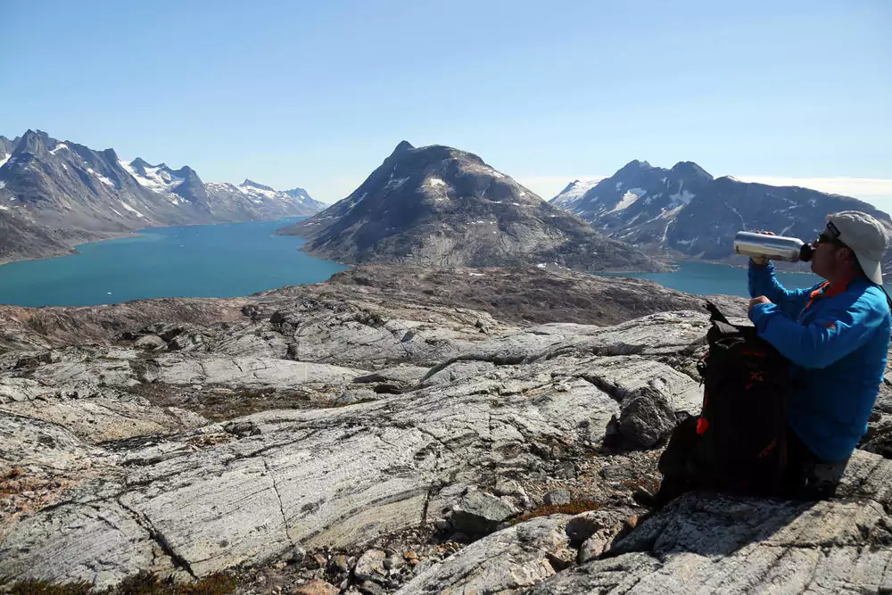 Mit Motorbooten, die unsere Ausrüstung samt der Kajaks transportieren, geht es über den Ammassalik-Fjord und den schmalen Ikasatsivaq-Fjord in Richtung Tiniteqilaq. Wir schlagen unser erstes Wildniscamp auf der Insel Sarpaq auf, die in unmittelbarer Nähe zu Tiniteqilaq gelegen ist, einer kleinen Jägersiedlung mit ca. 80 Einwohnern. Im Laufe der folgenden Tage haben wir Gelegenheit, bei einem Dorfrundgang Einblick in die hier lebendige Inuitkultur zu gewinnen.