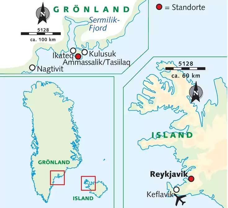 Unser Abenteuer Grönland beginnt am Flughafen von Keflavik. Hier startet unsere Turbopropmaschine und bringt uns in gut 1 1/2 Stunden Flugzeit an die Ostküste Grönlands. Auf unseren letzten 35 Flugkilometern können wir beim Blick aus dem Fenster bereits den Treibeisgürtel unter uns sowie die schroffe Bergwelt der größten Insel der Welt erblicken. Schließlich landen wir auf der kleinen Insel Kulusuk. Von hier aus geht es per Bootstransfer oder Helikopterflug weiter nach Tasiilaq (9 Übernachtungen).